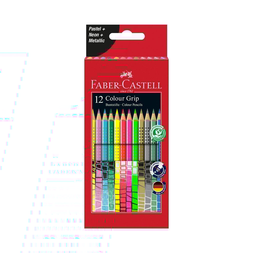 Faber-Castell Акварелни моливи Grip, 12 пастелни, неонови и металикови цвята