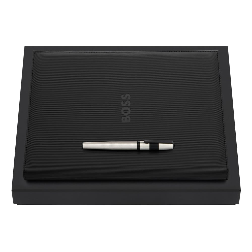 Hugo Boss Комплект папка Pinstripe, А4, черна и химикалка Cloud, хром