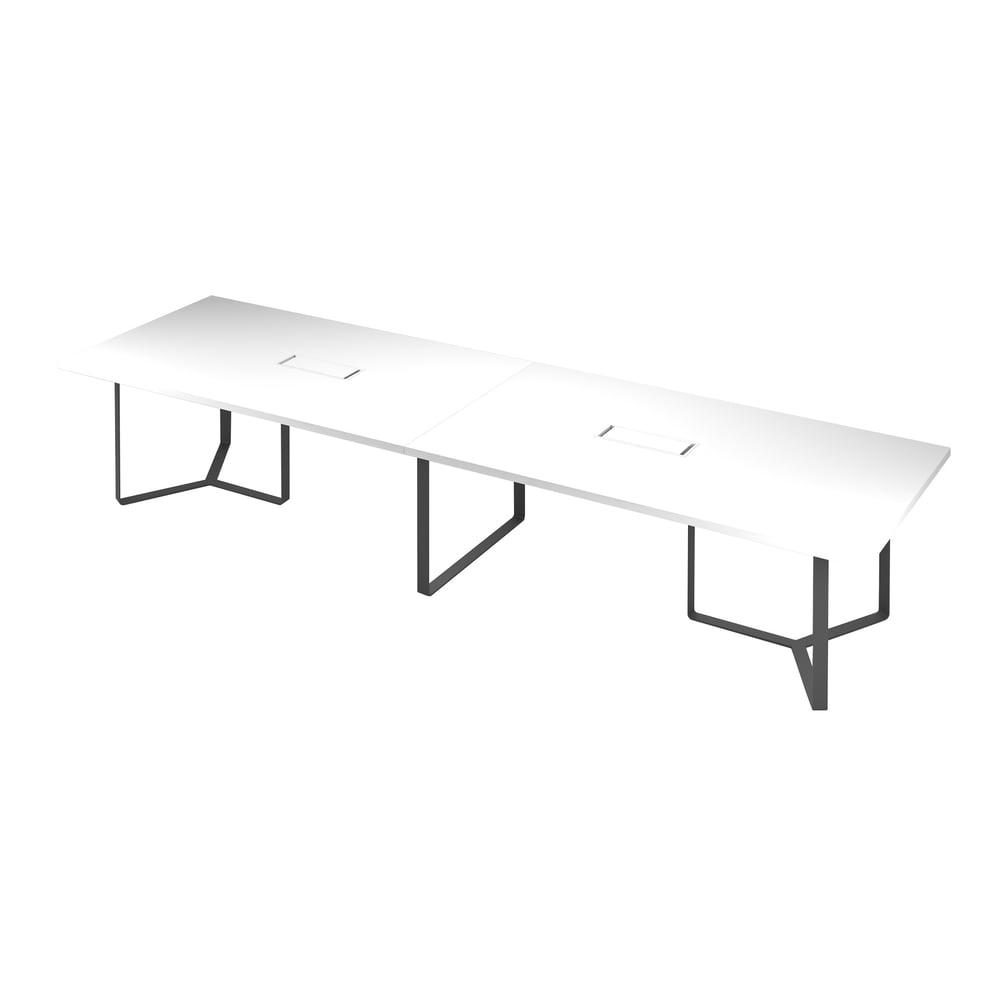Заседателна маса Narbutas Plana, 2400 x 1200 x 750 mm, правоъгълен плот, ПДЧ 36 mm, бял меламин, тъмносив метал, бял метал на кабелната кутия