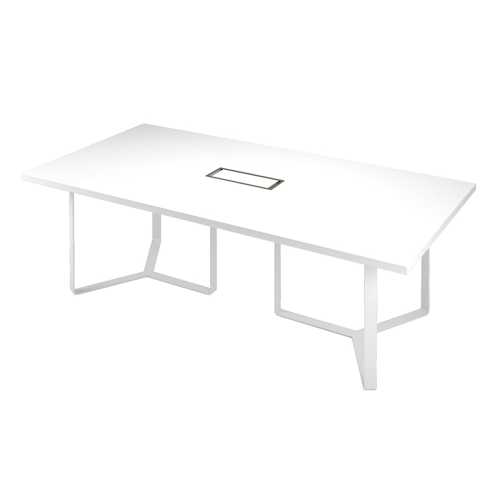 Заседателна маса Narbutas Plana, 2400 x 1200 x 750 mm, правоъгълен плот, ПДЧ 36 mm, бял меламин, бял метал, метал на кабелната кутия тъмен бронз