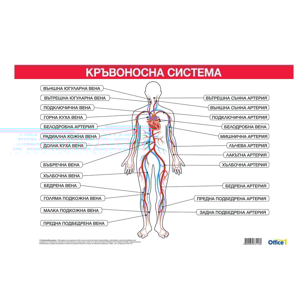 Office 1 Ученическо табло ''Кръвоносна система'', 100 x 70 cm