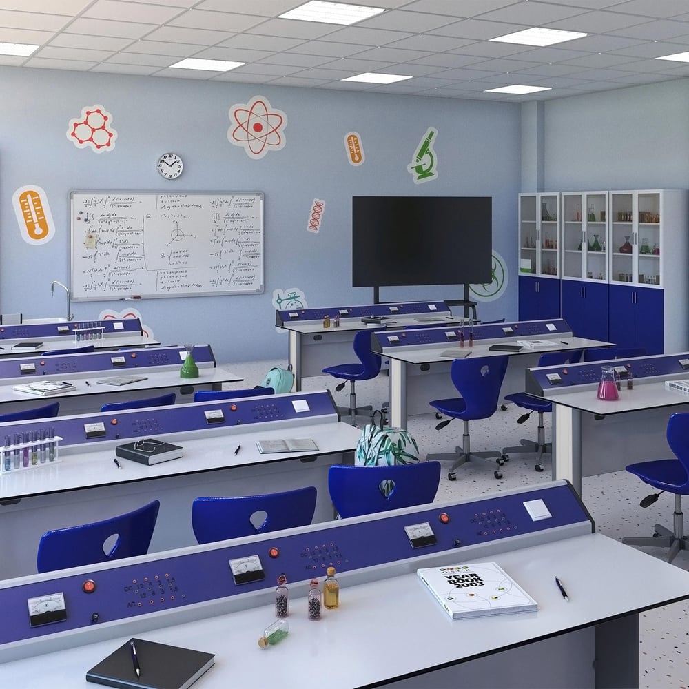Кабинет по физика RFG Flat, над VII клас, за 24 ученика, HPL плот, метални крака, бяло-син