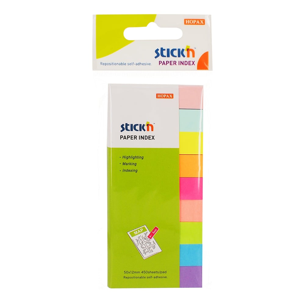 Stick'n Самозалепващи се индекси, хартиени, 12 x 50 mm, 9 цвята, 450 броя
