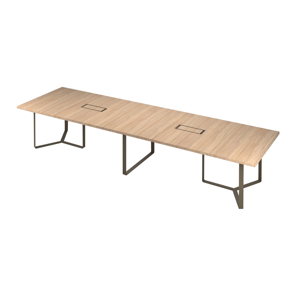 Заседателна маса Narbutas Plana, 2400 x 1200 x 750 mm, правоъгълен плот, ПДЧ 36 mm, избелен дъб, метал тъмен бронз, тъмносив метал на кабелната кутия