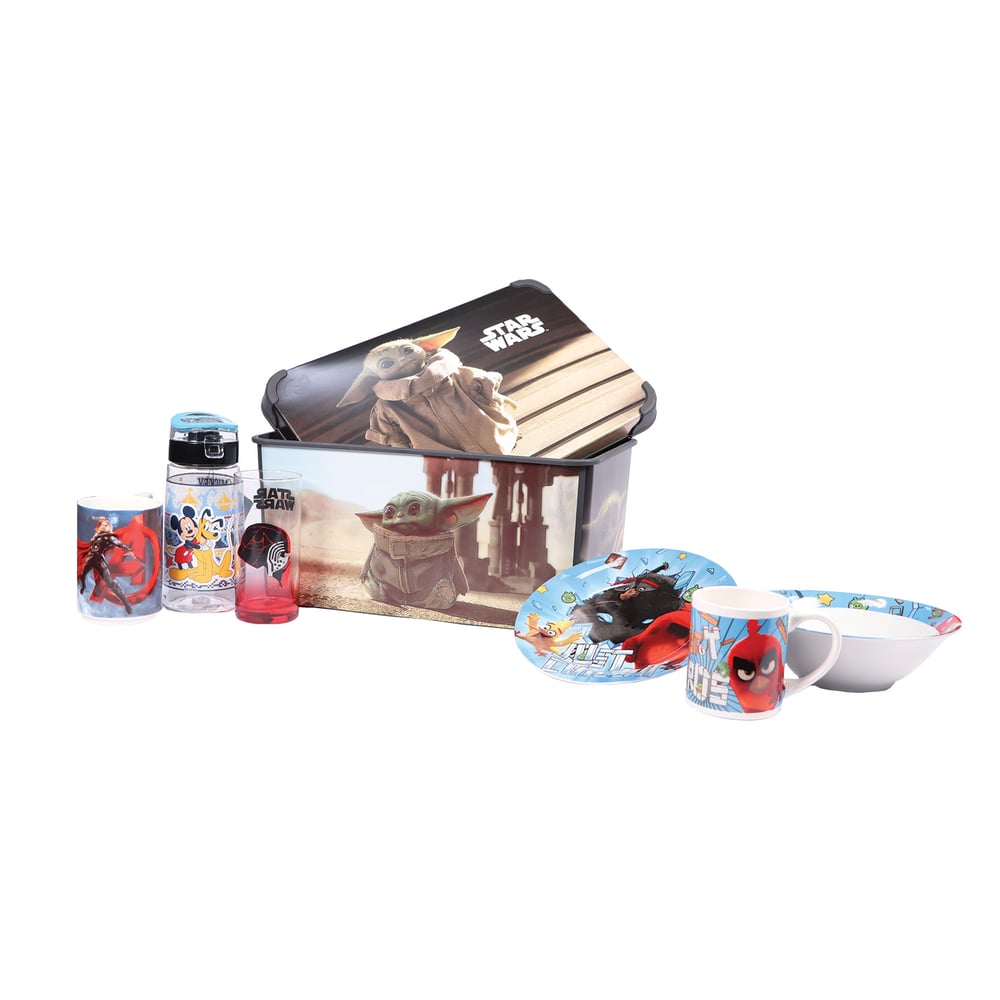Disney Set The Mandalorian, storage box 10 L, cup, plate and breakfast bowl, Mickey bottle 500 ml, glass and porcelain cup