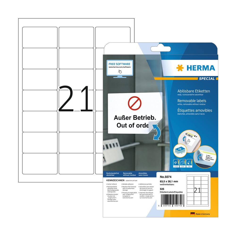 Herma Self-Adhesive Labels, A4, removable, 63.5 x 38.1 mm, 21 per sheet, 25 sheets