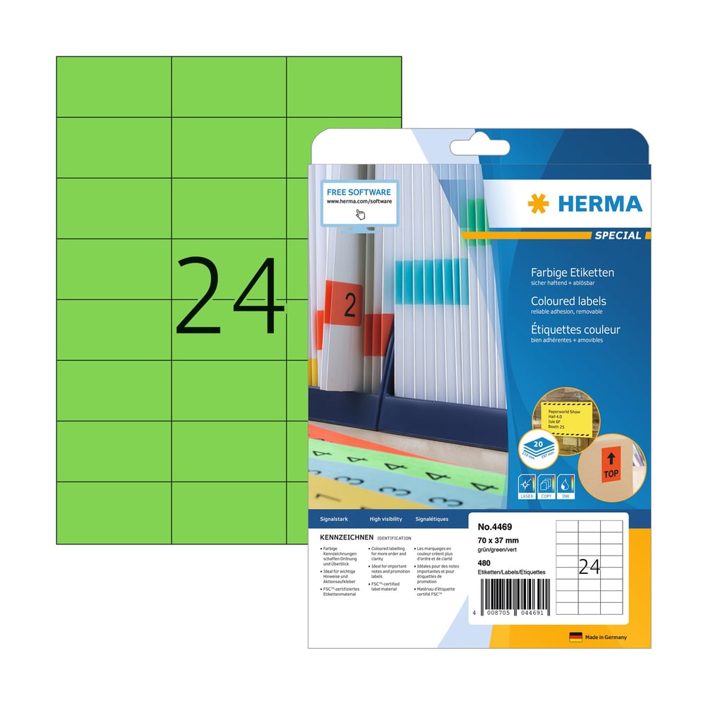 Herma Self-adhesive labels, A4, 70 x 37 mm, green, 24 per sheet, 20 sheets