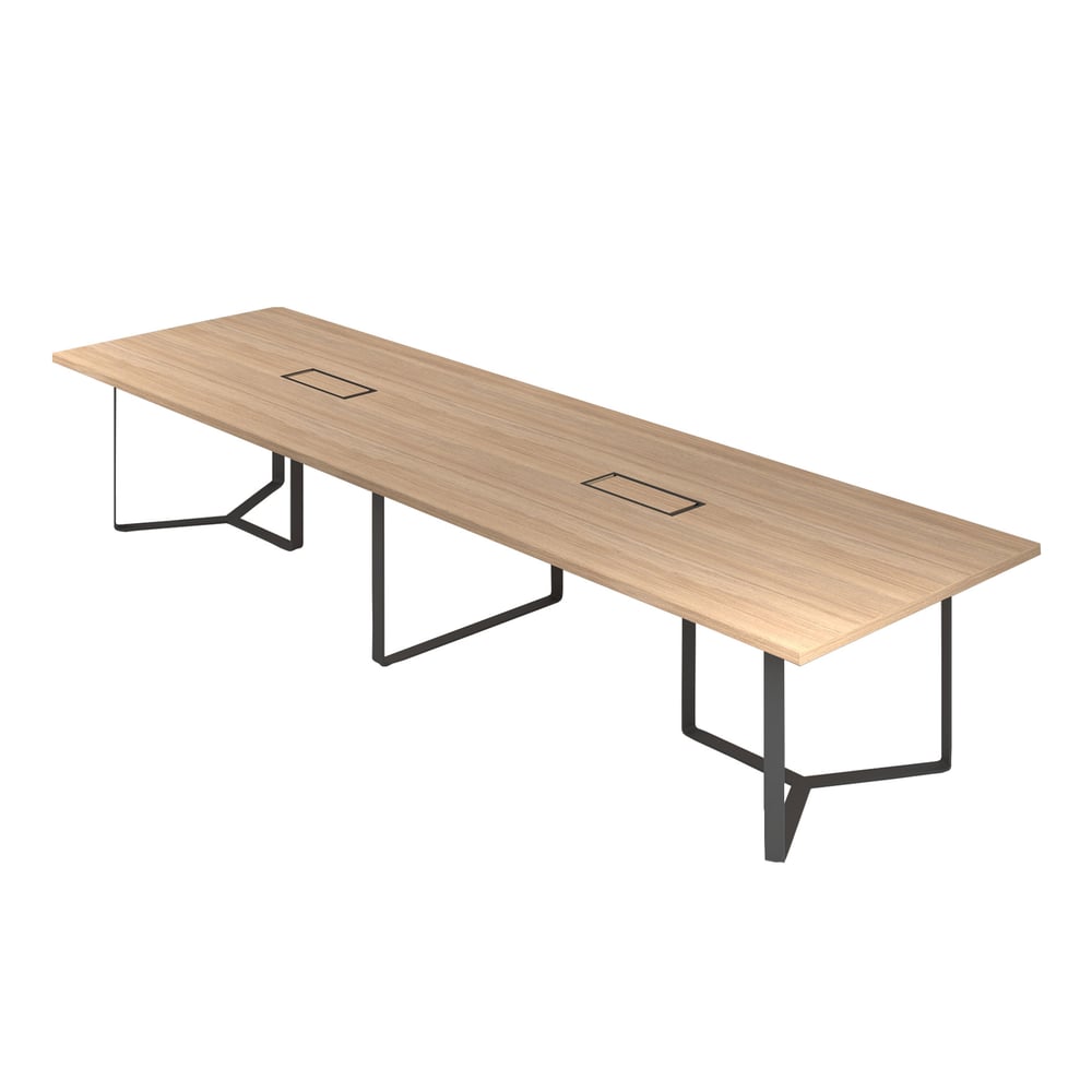Conference table Narbutas Plana, 4200 x 1200 x 750 mm, rectangular top, chipboard 36 mm, bleached oak melamine, black metal, grey metal cable box