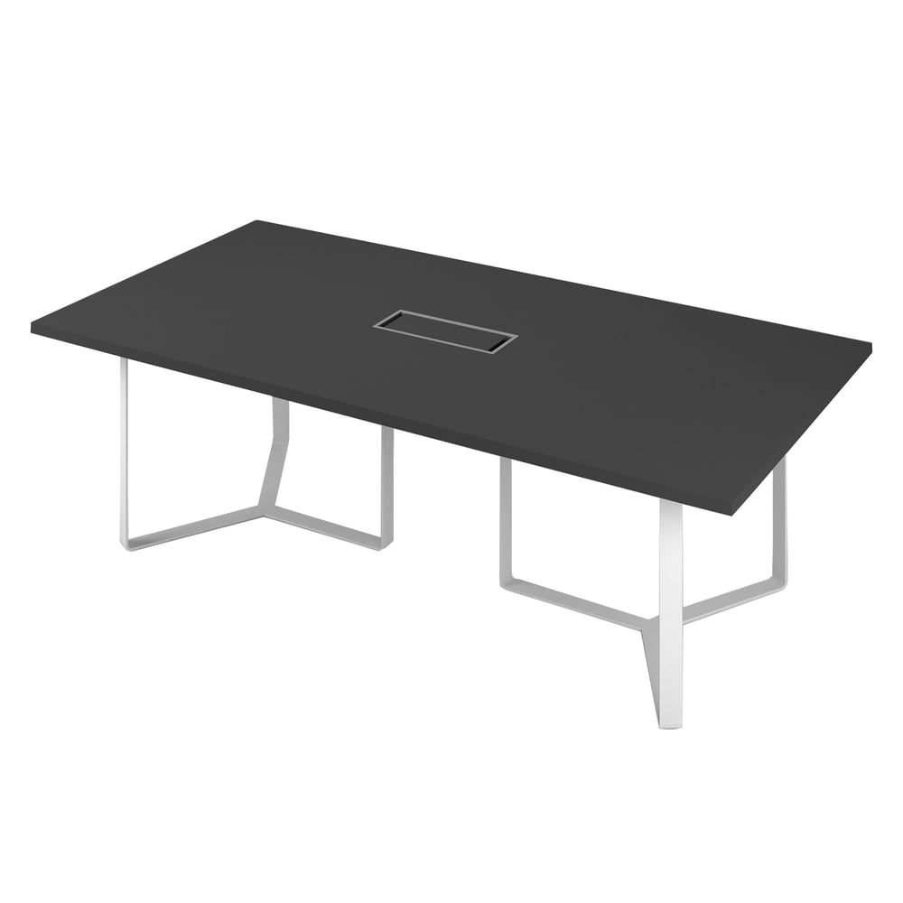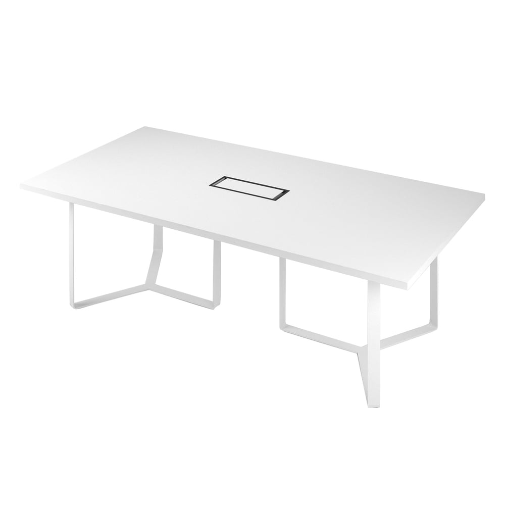 Conference table Narbutas Plana, 2400 x 1200 x 750 mm, rectangular top, chipboard 36 mm, white melamine, white metal, dark grey metal cable box
