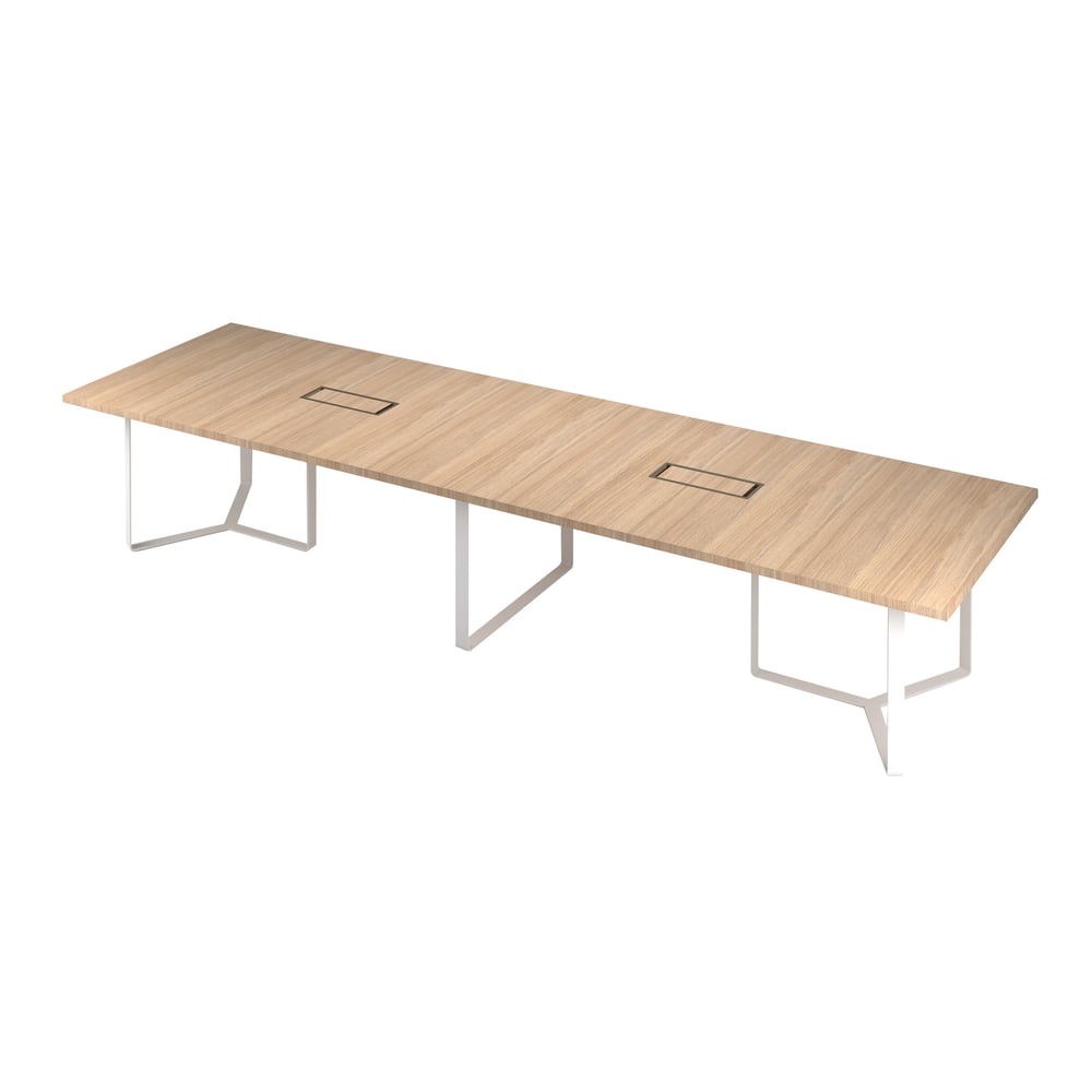 Meeting table Narbutas Plana, 4200 x 1200 x 750 mm, rectangular top, 36 mm particleboard, amber oak, white metal, cable box dark bronze metal