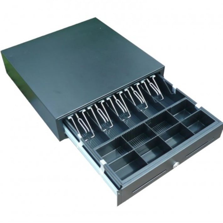 Black metal safe for case Daisy. Owns 5 banknote compartments and 8 coin compartments.