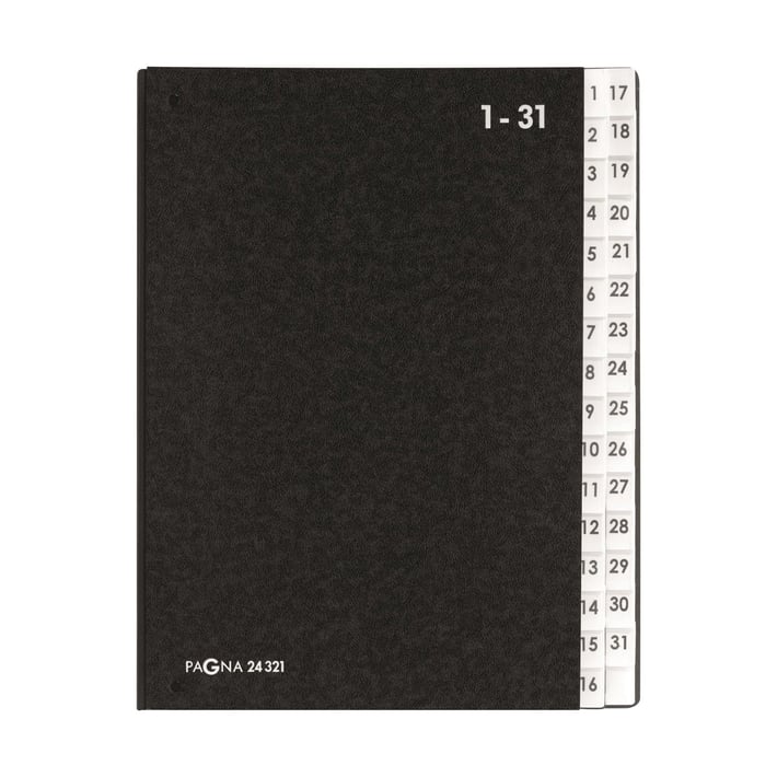 Made of robust black cardboard with reinforced PP dividers, it provides quick access to your documents.Thanks to the stretched and reinforced back, the folder holds a large volume of paper, while healthy, rough pages prevent The three control holes in the cover ensure additional organization and easy verification of the content.Locates with numbered dividers from 1 to 31, plus 1 total compartment.Dimensions: 265 x 340 x 40 mm.Format: A4.Guarantee period: 5 years.