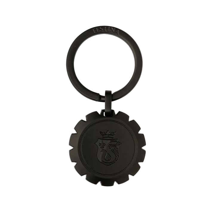 The black matt keychain is inspired by the button to stop the emblematic clock. It is distinguished with a beautiful decoration, finely engraved surface, which turns it into a fashion accessory.