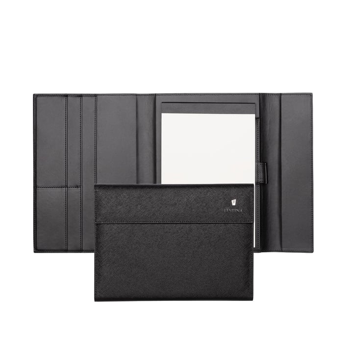 The folders "Chronobike" are perfect office accessories: simple and elegant. Artificial leather with saffron texture is soft and luxurious. This emblematic in the logo signature, also present on the pen, allows to create a real sense of cohesion through the collection and perfect assembly with the other products. The inside of the folder is arranged. and organized with multiple slots for cards and documents as well as a pen slot. Closing is by magnet. Each detail is carefully designed, each page of the luxurious paper loading is signed with the Festina logo.