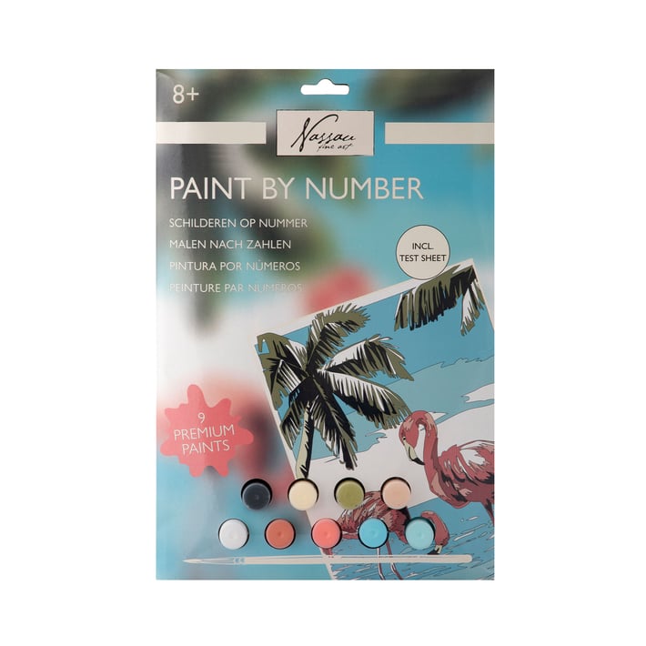 Draw the beautiful painting "Flamingo" with the help of the brush and the 9 paints in the lovely soft colors that are included in the kit.
