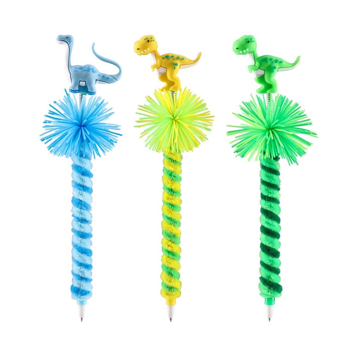 Pen SAZIO MACY with attractive design and decorative element in the shape of a dinosaur located at the top of the model.The pen is made of plastic and writes with blue ink, providing smooth and comfortable writing.It is suitable for everyday use in school, office or home and is distinguished by an original vision that makes it an interesting accessory for writing.