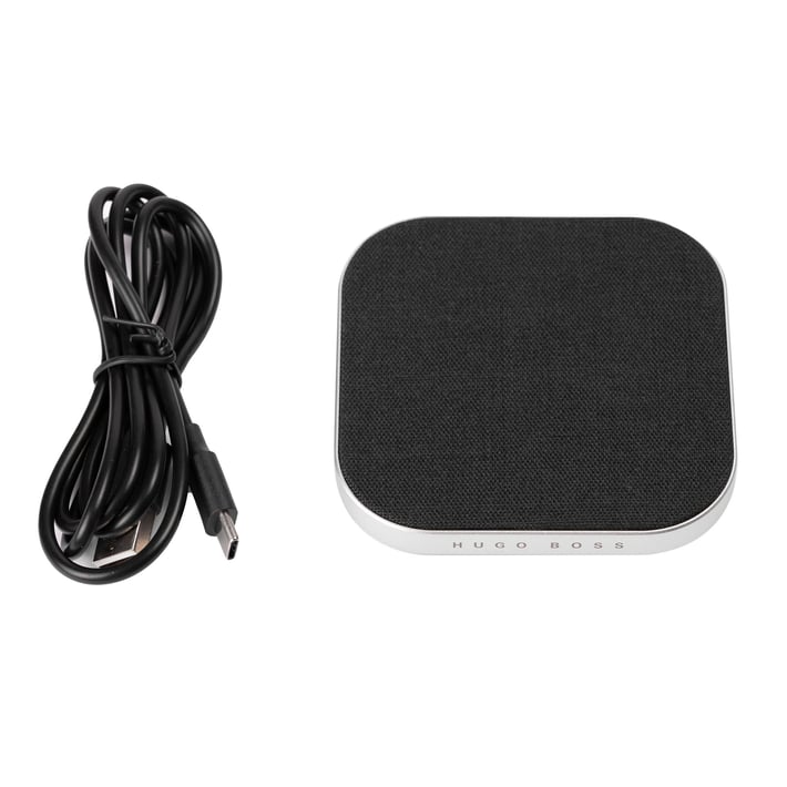 This wireless charger Hugo Boss is not only very practical, but also attracts the attention of your desk. From now on you will not need a cable to charge your smartphone. Just place the device on top and, done, it starts charging itself. Compatible with all Q1 devices. This square-design charger has an aluminum coating with elegant round corners and a fine Hugo Boss logo.The charging pad is made of fabric. The compact size facilitates carrying the charger with it. Includes 1M Type-C cable in the box.
