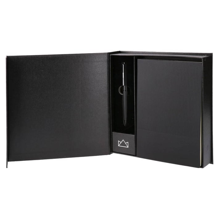 Gift set with notebook A5 and metal pen presented in a luxury box.The notebook has a soft polyurethane cover with a pleasant touch surface and contains 100 pages per line with 80 g paper.The kit is suitable for business gift or everyday use in office environment.