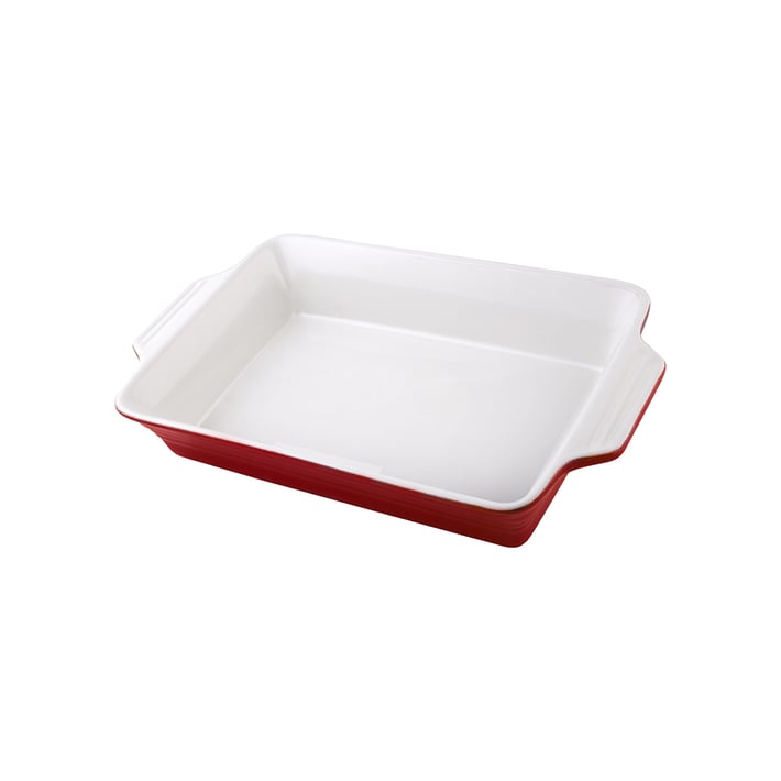 Rectangular ceramic tray suitable for the preparation of meat, lasagna and other dishes in an oven.
