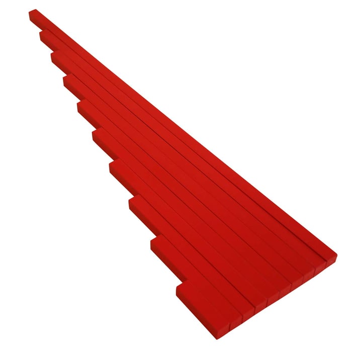 Montesori-material consisting of 10 red slats of 10 to 100 cm long. Each bar is longer than the previous one by 10 cm.