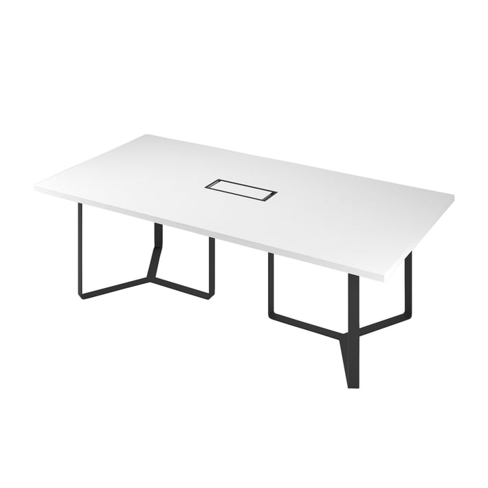 Conference table Narbutas Plana, 2400 x 1200 x 750 mm, rectangular top, chipboard 36 mm, white melamine, black metal, dark grey metal cable box