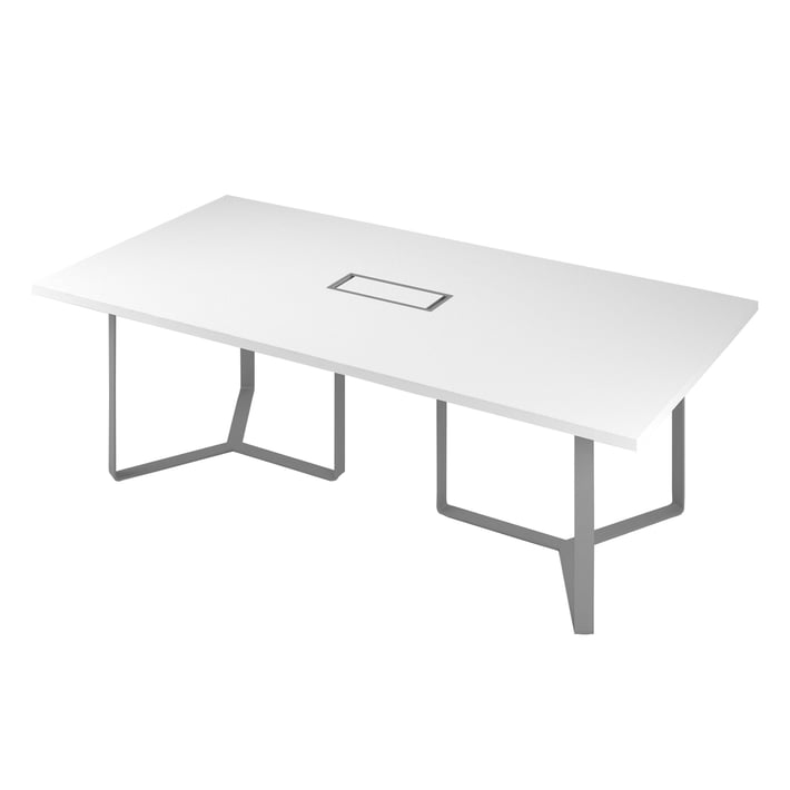 Conference table Narbutas Plana, 2400 x 1200 x 750 mm, rectangular top, chipboard 36 mm, white melamine, dark bronze metal, white metal cable box