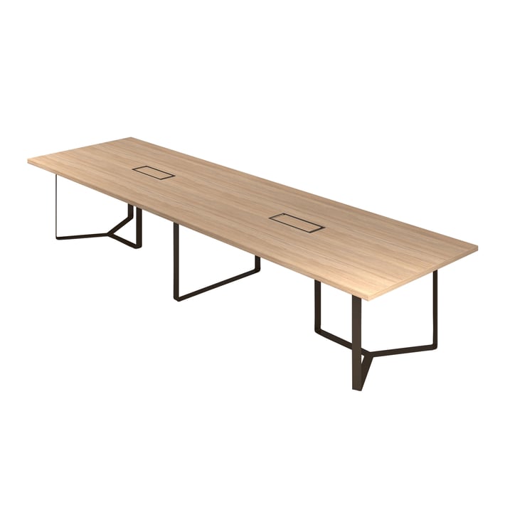 - Meeting table Narbutas Plana, 4200 x 1200 x 750 mm, rectangular top, 36 mm particleboard, amber oak, bronze metal, cable box black metal