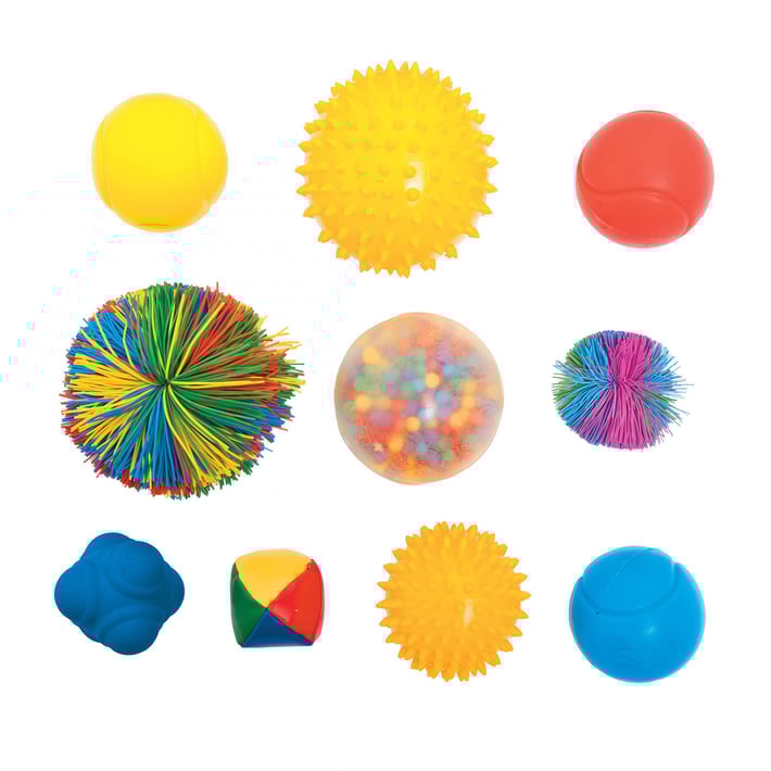 Set of 10 sensor balls: beads ball, foam balls, rough balls, cubes, circus ball, fringe balls.