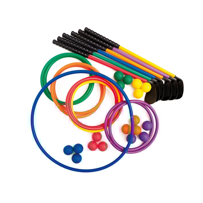 6 clubs (74 cm) in 6 colors, with rubberised area for comfortable grip;
