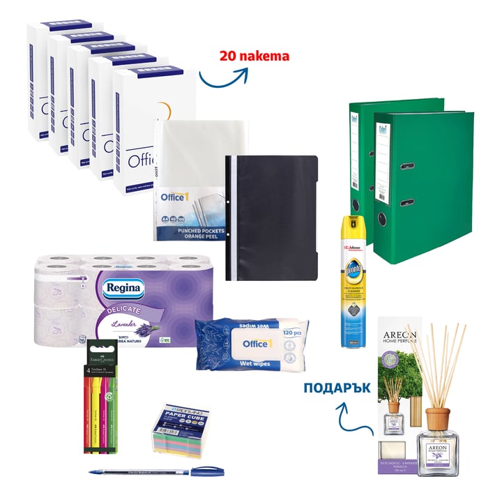 Office 1 Paper pocket, A4, 40 microns, mat, 100 pieces - 2 packages.Economy, PP, punched, black, 50 pieces.Office 1 Wet towel Jumbo, with lid, 120 pieces.Regina Toilet paper Lavender, cellulose, three-ply, 135 short, 16 pieces.Office 1 Self-adhesive indices, paper, 20 x 50 mm, neon, 4 colors, 200 pcs. Colori Classic, 5 cm, PP, no metal edge, green - 3 pcs. Colori Classic, 8 cm, PP, no metal edge, green - 3 pcs. Faber-Castell Chemical 032 M, blue - 10 pcs.Faber-Castell Text Marker 38, 4 colors.Fabriano Paper Cube, 83 x 83 mm, 80 g/m2, colour, 360 sheets.Pronto Preparation Multi Surface, universal, 400 ml.Areon Flavorer Home Perfume, sticks, Patchouli Lavender, 150 ml.