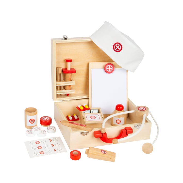 The doctor is coming! Young doctors will be well equipped when they go to their patients, with this doctor's wooden kit. The case and all medical instruments make a great impression with their classic colors and quality craftsmanship. In addition to a bottle of tincture, stethoscope and syringe, the kit also includes patches, tablets, This kit has everything needed to provide first aid to dolls or animals toys! Switching as a doctor and treating patients inspires creativity and strengthens the self-esteem of children. The role of doctor and patient care promotes creativity while strengthening Children's self-esteem. All accessories fit in the wooden suitcase.