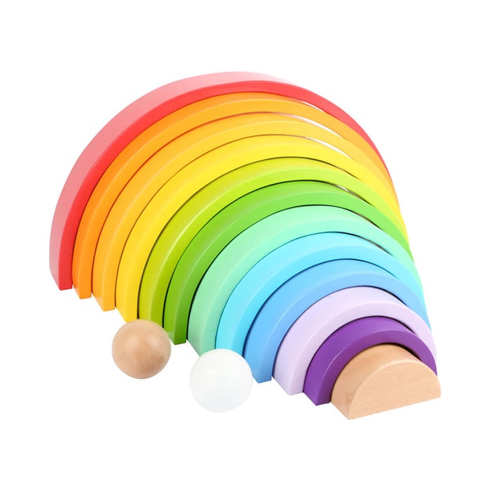 When assembled in a row, the individual arches can become a long tunnel in which the two balls can roll. In addition, the arc can be sorted and arranged, or can be made as a cradle for stuffed animals. This game encourages creativity in children. What color is the most beautiful?