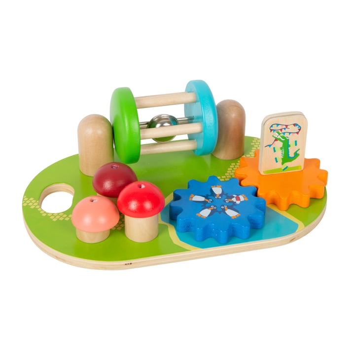 The board includes a game with gears, turning elements and a spinning rattle, providing a variety of activities for children.