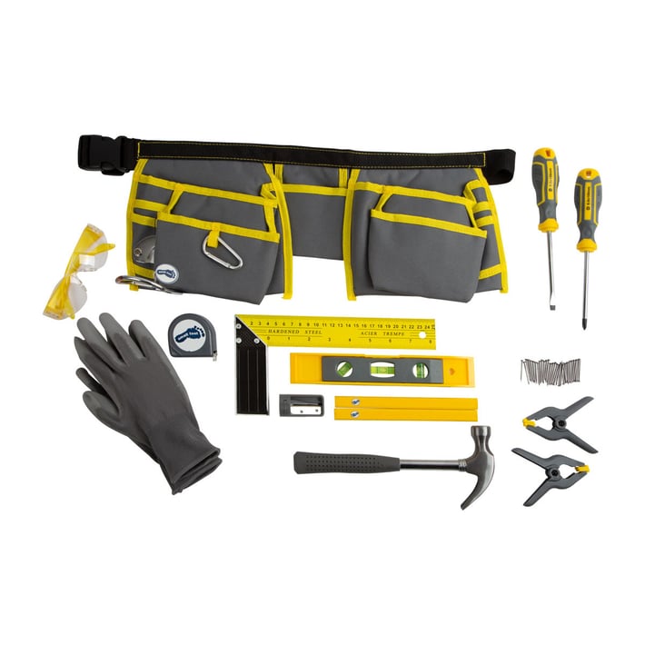 Whether its the carpenters hammer, the flathead and Phillips (cross-headed) screwdrivers, the carpenters square with a ruler made of metal, the ergonomic protective eyeware, the PU work gloves, the clamps and nails, the carpenters pencil incl. fitting sharpener and measuring tape - this large set of childrens tools is a must-have! The individually adjustable belt with a click buckle has 8 compartments, a metal hammer loop, and a snap hook so that every tool has its proper place. The spirit level is a hit with its ability to be hung up and a magnetic strip on the side, and is versatile thanks to the horizontal, vertical, and 45° levels.