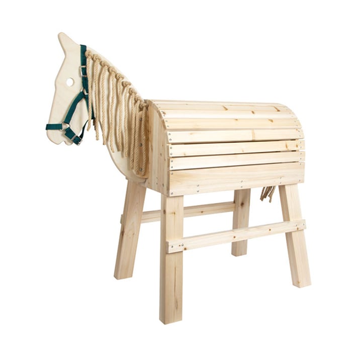 Both small and larger riders can learn the basics of horses, ponies and riding with this large horse to play made of raw, weather resistant wood. The bracelet and tail made of sisal invite children to shape and braid them, and the foot allows small children to easily get on the horse. Its wide legs provide a stable and safe posture. In the belly of the horse there is a large storage area where the head collar, cleaning tools and accessories can be placed.