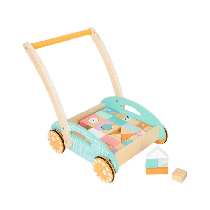 Learn to walk with the rabbit, the panda and their friends! This walker in pastel colors supports the children in their first attempts to walk. The 34 building blocks, which are partially naturally processed and partially painted in soft pastel tones, promise double entertainment and encourage the development of understanding of the forms, motor skills and creativity of young masters. The rubber wheels protect the floors and offer quiet rolling fun. With integrated axle!