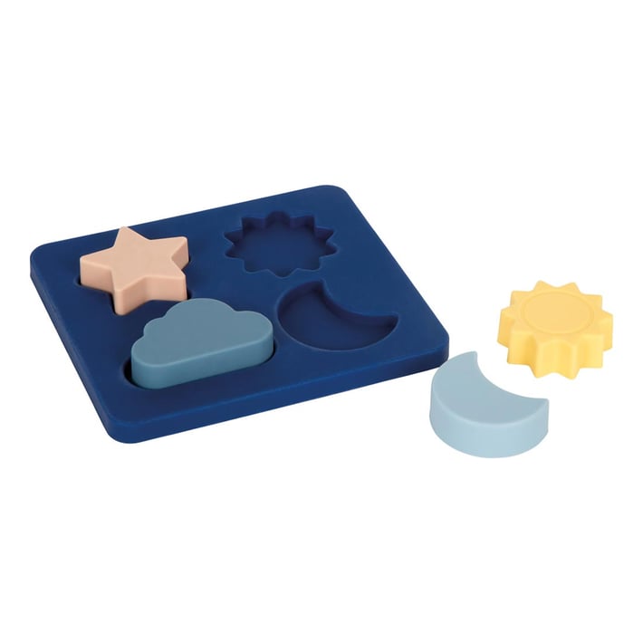 A toddler?friendly first puzzle made of soft, food?grade silicone. With sun, moon, cloud and star pieces that can be inserted with either the open or closed side, it encourages curiosity, matching and sensory exploration—even in the bath or sandbox.
