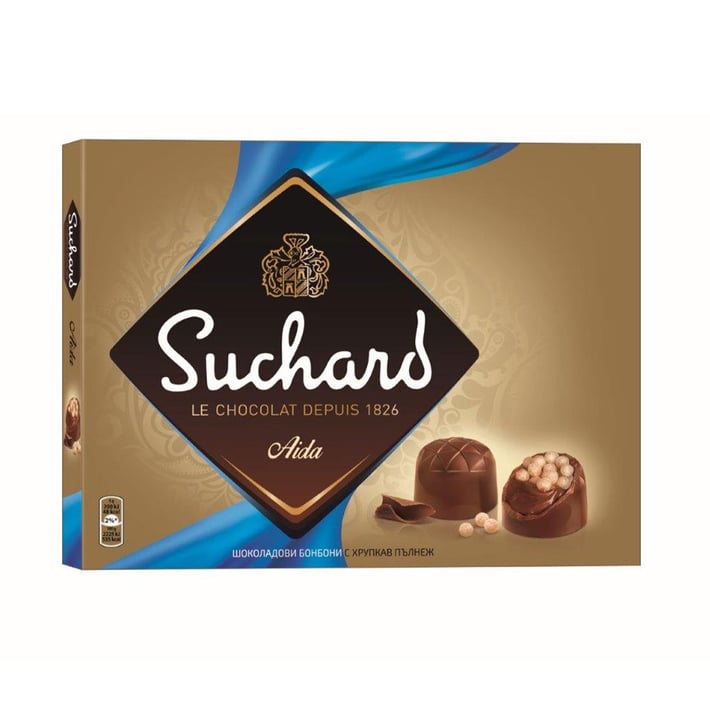 Milk chocolate candies with cocoa filling (46%) with caramel flavor and rice crimp (3%).