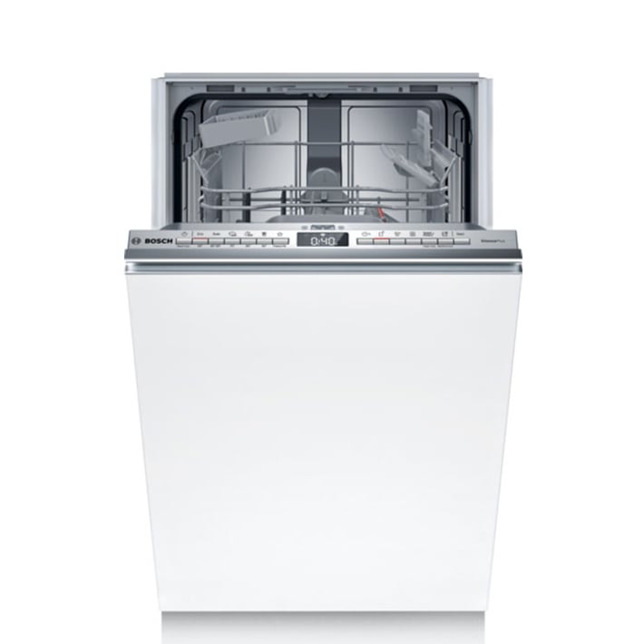 Full-built dishwasher offering flexible charging and smart remote control via the Home Connect app.