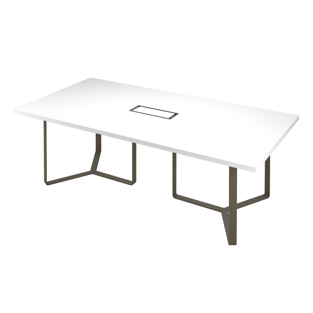 Conference table Narbutas Plana, 2400 x 1200 x 750 mm, rectangular top, chipboard 36 mm, white melamine, dark grey metal, dark bronze cable box