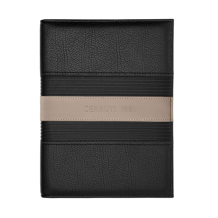 Представяме ви папка за писане CERRUTI 1881 Delano, изработена от веган кожа в класическо черно с контрастна бежова лента и голямо, фино релефно лого.