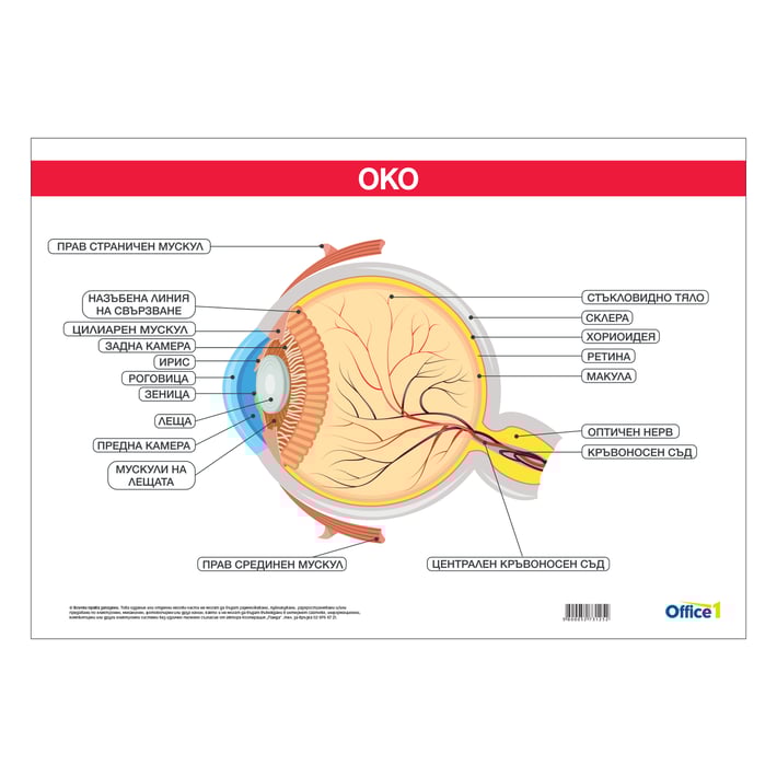 • Човек възприема чрез зрението си 85 % от информацията за околната среда. На табло „ОКО” в детайли е представено устройството на окото.