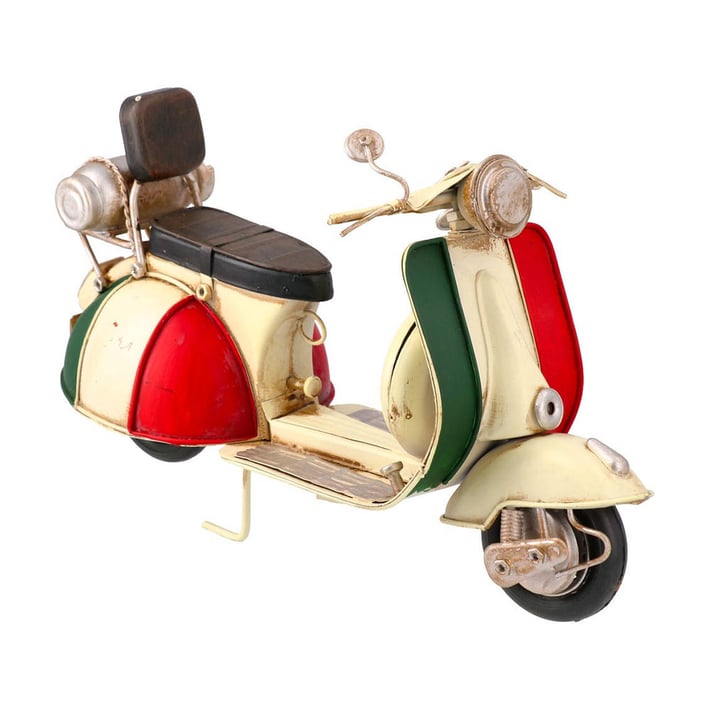 Елегантна декоративна фигурка на ретро скутер, вдъхновена от класическия италиански стил. С характерните цветове на италианското знаме и винтидж излъчване, този модел носи духа на романтичните улици и безгрижните пътувания.Изработен от метал с внимание към детайла – от кормилото и фарa до седалката и калниците – скутерът е стилен акцент за дома, офиса или витрина. Леко състарена визия придава автентичност и чар.Перфектен избор за любителите на пътешествията, ретро стила и средиземноморския дух.