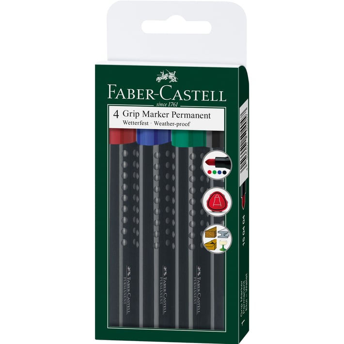 Устойчив на атмосферни влияния, устойчив на светлина и с отлична адхезия, перманентният Grip маркер е с ергономична триъгълна форма и Grip зона на захващане. Идеален е за писане върху гладки повърхности, като стъкло, дърво, метал или картон. Наличен е с два различни вида върхове – объл или скосен, позволяващ маркиране с различен размер линии. Предлага се в 4 цвята на мастилото: черен, син, червен и зелен. Лесно и чисто презареждане чрез мастилница Permanent 1505 – само потапяте върха на маркера в нея и специалният пълнител се презарежда от 12 до 24 часа.