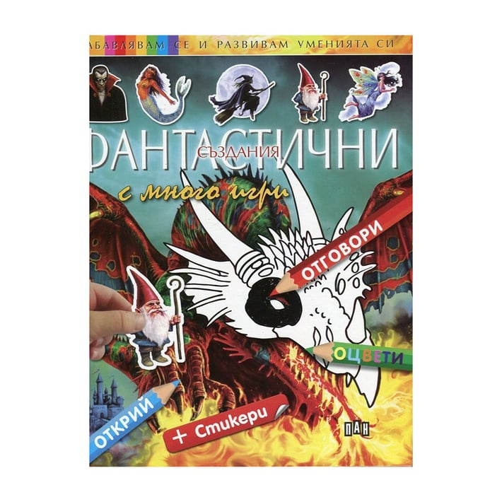 Тази книжка е едновременно забавна и полезна. Докато оцветява, рисува, свързва точките, лепи стикери и отговаря на въпросите, детето неусетно ще научи любопитни факти за фантастичните създания и ще развие наблюдателността си.