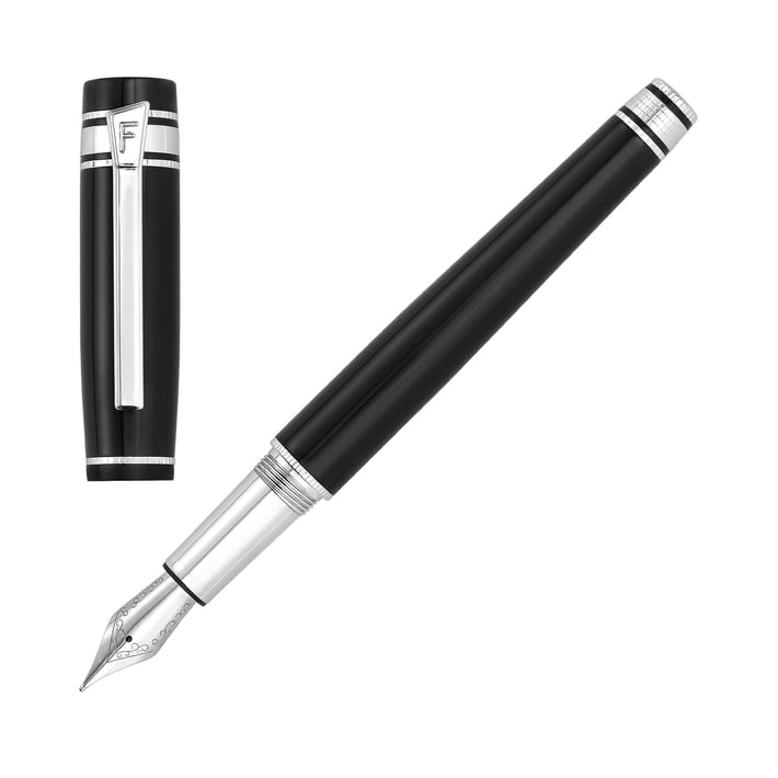 Леко уголеменият силует на писалката е завършен с лъскав лак и подсилен с хромирани акценти и детайлни гравюри.