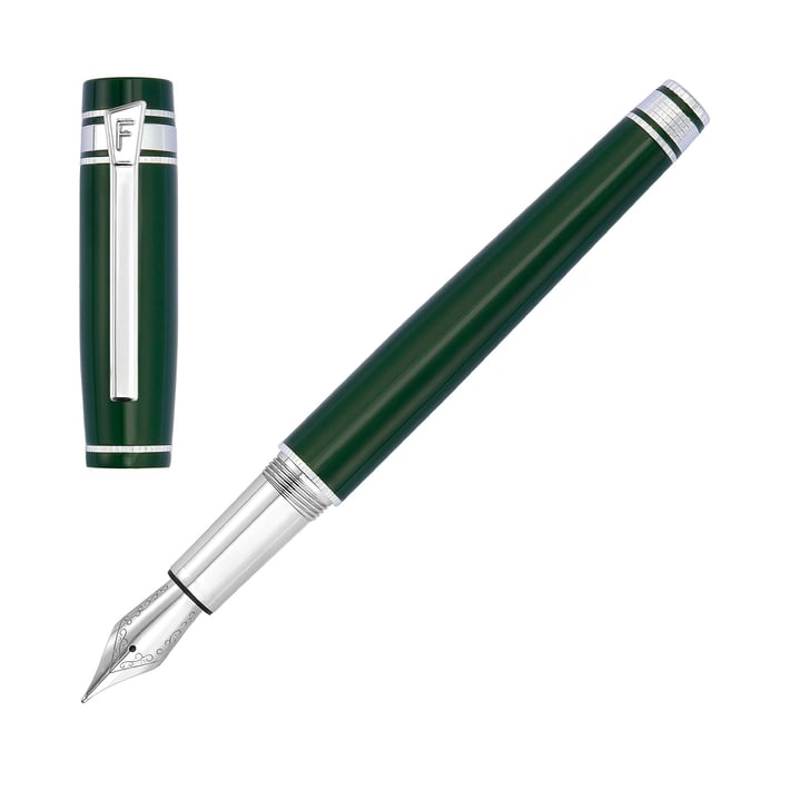 Леко уголеменият силует на писалката е завършен с лъскав лак и подсилен с хромирани акценти и детайлни гравюри.