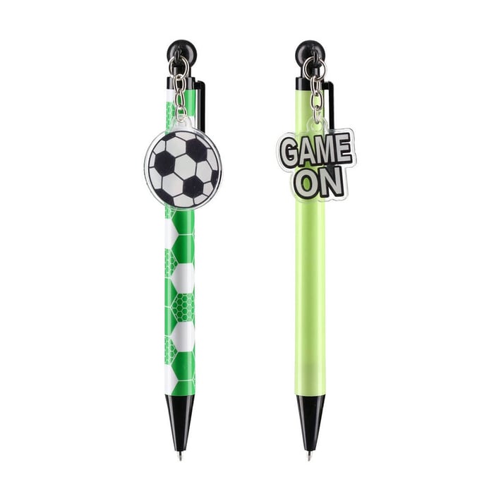 Комплект от 2 химикалки Cambridge с декоративни ключодържатели с футболен мотив. Моделът се отличава със свежа зелено-черно-бяла цветова палитра и хексагонален десен, допълнен от атрактивни висулки – футболна топка и надпис „GAME ON“, които засилват визуалното присъствие на рафта. Химикалките са с пластмасово тяло и прецизна изработка, подходящи за ежедневна употреба. Идеален избор за подаръчни комплекти, спортен асортимент и фен артикули.