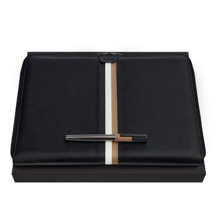 Този изискан сет комбинира A4 папка и стилен химикал, създадени в модерен и премиум дизайн. Контрастът между меката полиуретанова повърхност и металните детайли придава усещане за класа, а комбинацията от черно, тъмносиво и топъл кафяв акцент прави комплекта универсален и подходящ като бизнес подарък. Перфектен избор за професионалисти, които ценят детайла и качеството.