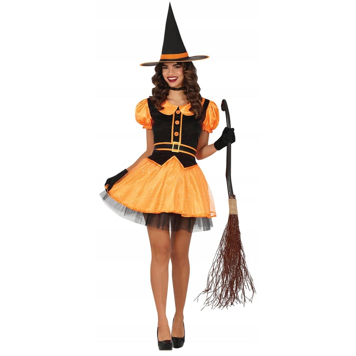 Костюмът се състои от освежаваща оранжева рокля и вещерска шапка. Метла, ръкавици и други аксесоари не са включени.